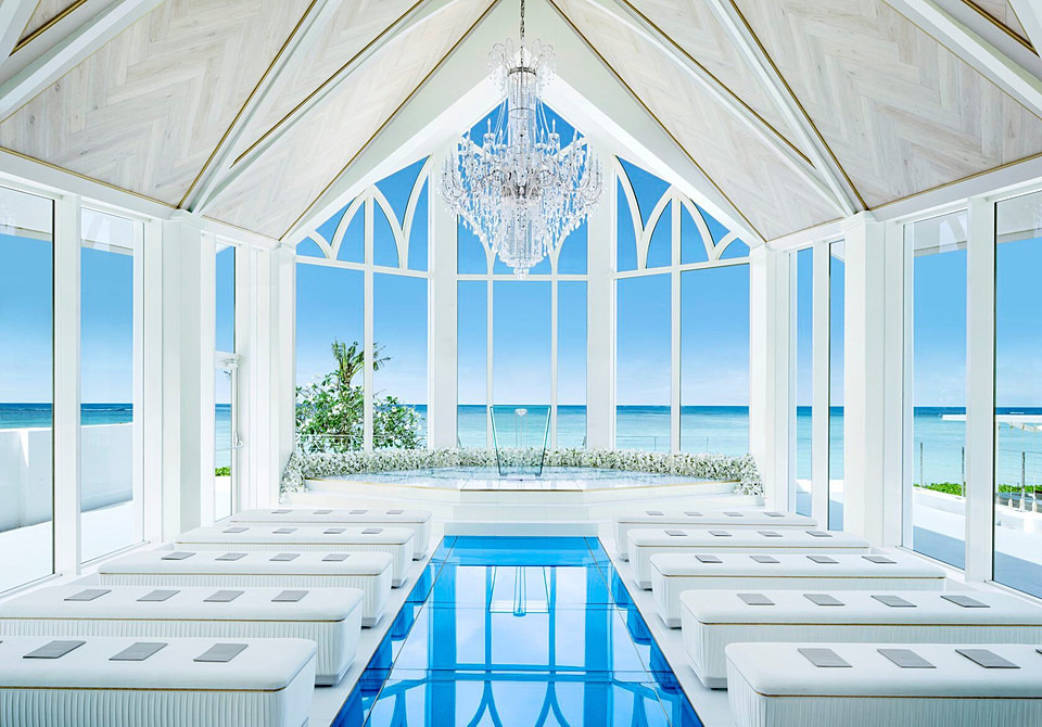 エメラルドグリーンの海をバックにした白ぼりのチャペル。開放的で神秘的な空間をお楽しみください。 壁一面ガラス張りで美しい海を一望できます。